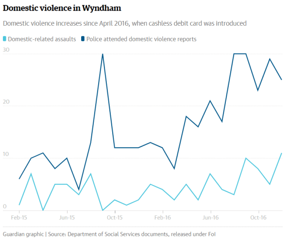 The cashless debit card was launched in Kimberley in April 2016. Ceduna joined the tryout around the same time. And here is the crime rate chart in the Kimberley community of Wyndham since the cards were introduced.
